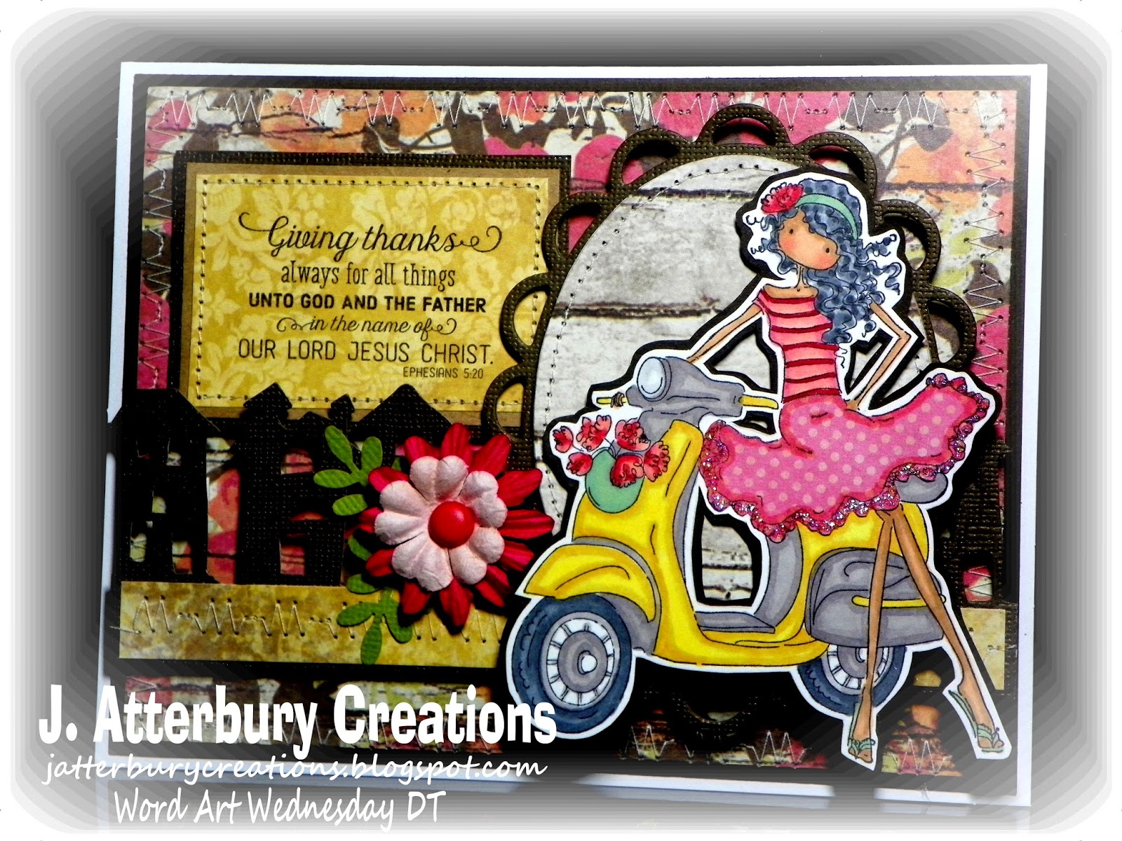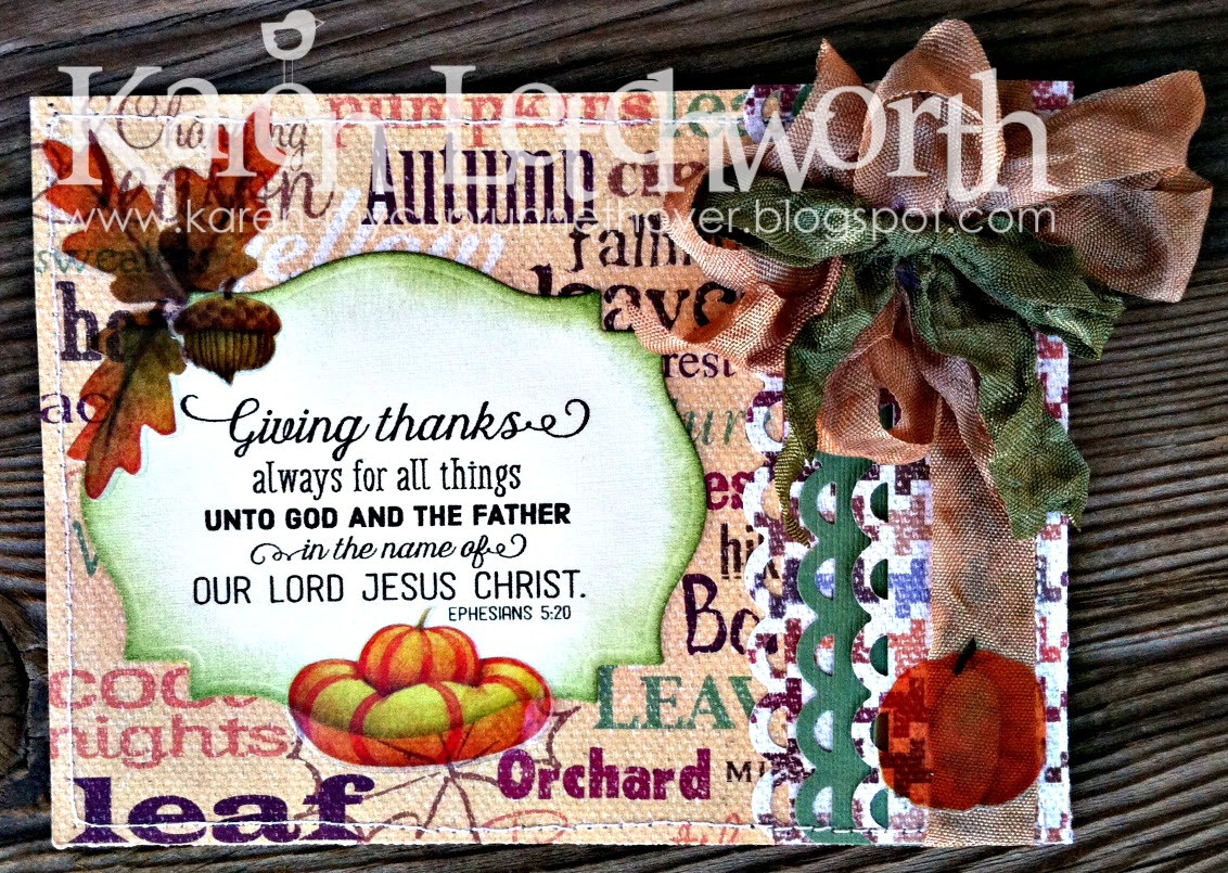 This week's word art scripture is Ephesians 5:20, and this one simple verse can profoundly impact our lives in a powerful way. As many of you know, I recently lost my most precious Sister-in-Law to brain cancer. It would be easy for me to get depressed, angry, and upset; but I won't. I could share with you all the terrible heartaches each of our Design Team Members have recently faced; and you would agree that we all have a reason to be upset. However, we all face choices every day. Choices about our attitudes, and how we look at life. What would it benefit us to be permanently sad about circumstances we cannot control? This powerful verse reminds us that in EVERY situation, there is MUCH for which we can (and should) be thankful. I've grown closer to my Brother-in-Law, and have rekindled some amazing relationships within our family. I would be writing pages and pages if I were to sit and name ALL the blessings God has placed in my life; even through Audra's death. We are a blessed people! Another DT Member recently went through a horrific family ordeal concerning a grandchild; but rather than get upset with our gracious and sovereign God, she has chosen to count her blessings and trust God's sovereign and wise decisions. Your blessings will ALWAYS outweigh your burdens. And if they don't, YOU NEED TO GET ON YOUR KNEES AND GET REAL ABOUT HOW VERY BLESSED YOU ARE. We tend to take MUCH for granted. When you wake up in the morning, THAT is a blessing. I encourage you to start your day praising God for even the small things. For instance, when is the last time you thanked God for your ten fingers or ten toes, your ears, eyes, hair, etc.? They could be taken from you in an instant, yet are often taken for granted. The same is true of our family members, our jobs, our food, our warm beds, etc. There is NO END to the list of blessings in our lives. Yes, we will all have heartaches, and things WILL go wrong. But in EVERY circumstance, look for the good things, and give God the PRAISE and the GLORY He SO deserves.
